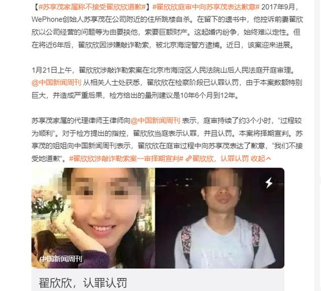 1月21日中午,翟某敲诈勒索案在北京市海淀区人民法院山后人民法庭结束一审。据苏某家属称,翟某出庭接受审理,对指控的敲诈勒索罪名认罪认罚。