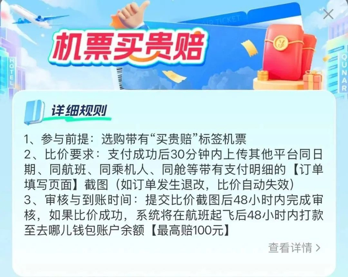 在部分票务平台,机票搜索页面会有“机票价格非固定,会实时变动”的提醒。在购票选择时,还有“买贵赔”套餐可选择。该套餐指乘客在购买含“买贵赔”服务的机票后且在支付成功后30分钟内上传其他平台同日期、同航班、同乘机人、同舱等带有支付明细的订单填写页截图,即会进入审核,审核通过后最高赔偿100元。