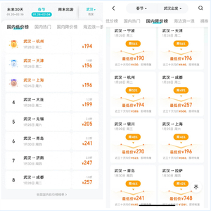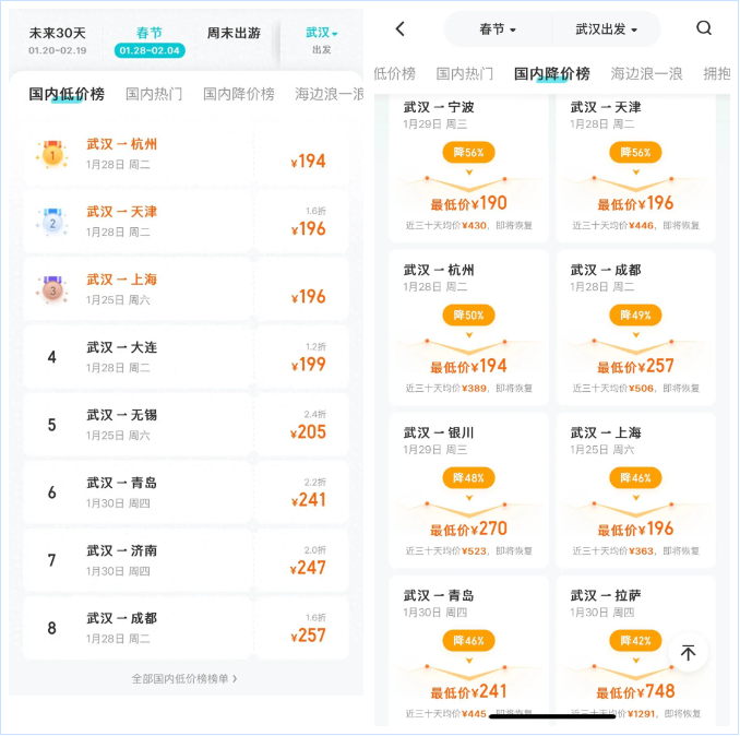 在机票价格方面,不少主要航线的机票价格降幅较大。以武汉出发的机票为例,春节假期期间,武汉到宁波、天津降价56%,到杭州降价了50%。