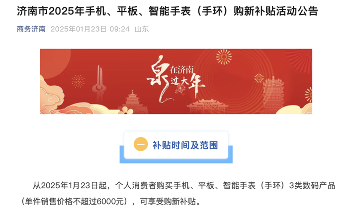 2025年1月23日,济南市商务局发布《济南市2025手机、平板、智能手表(手环)购新补贴公告》,有购机需求的消费者可以通过领取补贴券的方式进行费用减免,最高可减免500元。