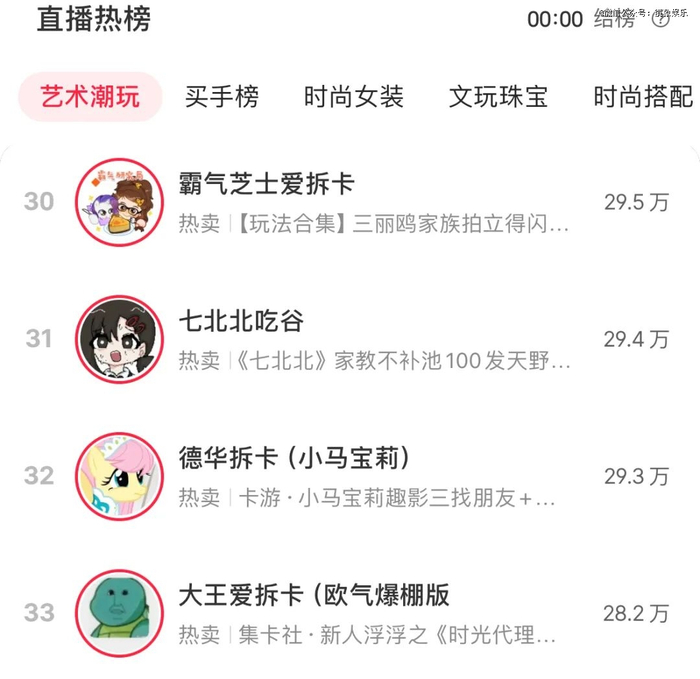 比如2024年年初开始在小红书代拆卡游生产的相关IP周边的霸气甜妹爱拆卡,因“人美声甜”一年不到粉丝上涨到119万,单周涨粉最高达到14万人,如今,她的拆卡直播间在线人数通常能达到数百人。此外,2024年年底才开始发力的老碌拆卡,近期也是小红书直播热榜中艺术潮玩类榜单上的常客,他的直播间销售的IP周边则是宝可梦相关产品。