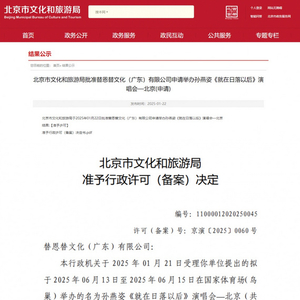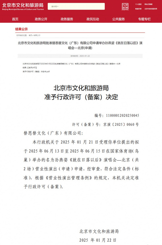 1月22日,据北京市文化和旅游局网站消息,孙燕姿2025《就在日落以后》北京鸟巢演唱会(2场)获批,将于6月13日至6月15日开唱。