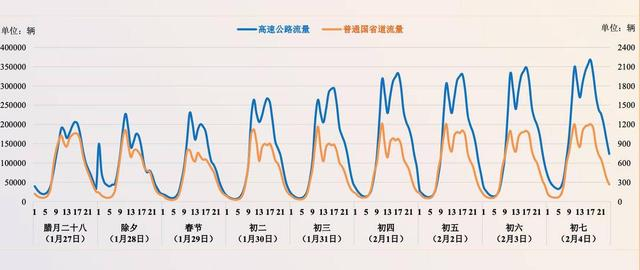 春节假期,江苏高速公路、普通国省道日均出口流量预计同比增长约1%、3%。每日出行高峰基本集中在8:00-12:00,16:00-22:00。