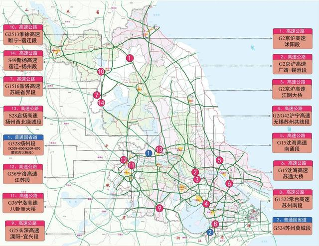 全省有8个高速公路路段、20个普通国省道路段在施工中。预计还有G2京沪高速沭阳段、广靖—锡澄段、江阴大桥等14个高速公路路段和524国道苏州莫城段等2个普通国省道路段,高峰时段易发生拥堵缓行。请过往车辆驾驶人员谨慎通行或提前绕行。特别是假期最后一天(2月4日)集中出行期间,建议尽量避开易缓行路段(收费站)及限行管控路段,错时错峰出行。