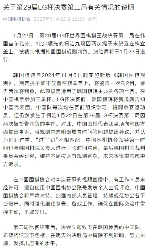 1月22日晚,中国围棋协会发布《关于第29届LG杯决赛第二局有关情况的说明》: