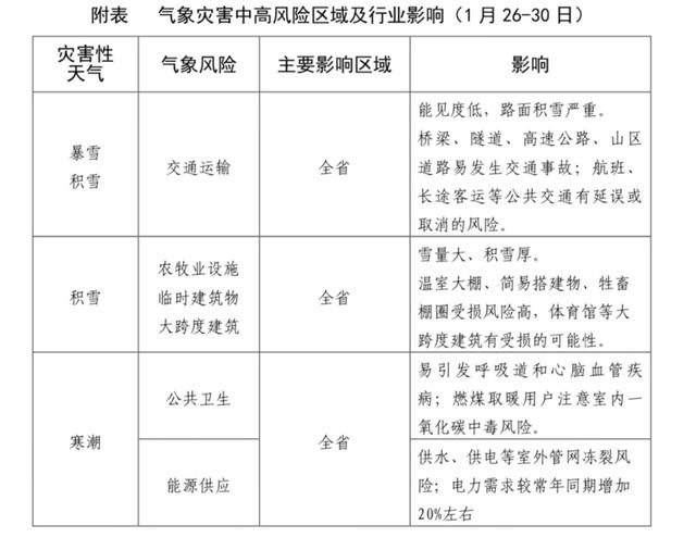 预计2025年1月26日—1月30日,全省大部有暴雪及路面积雪灾害的高风险,同时伴有寒潮降温灾害的中风险。