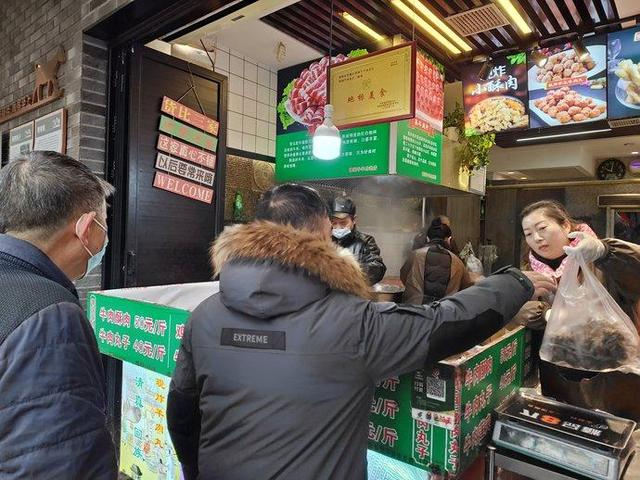 元旦以来,锋国牛羊肉老店就成为北顺城街人气最旺的店铺,店内选购生鲜牛羊肉的人群走了一波又来一波,店外上百位市民排队等待购买新鲜出锅的炸牛肉丸子,门口摆放的“民族八大碗”也被人一箱箱地搬上了车。