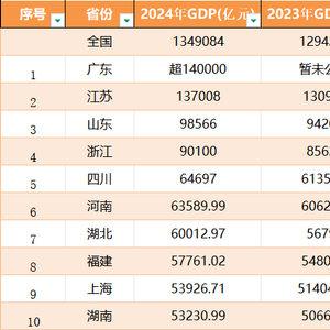 伴随着各省市经济数据相继发布,根据GDP由高至低排列,2024年中国经济十强为:广东、江苏、山东、浙江、四川、河南、湖北、福建、上海、湖南。