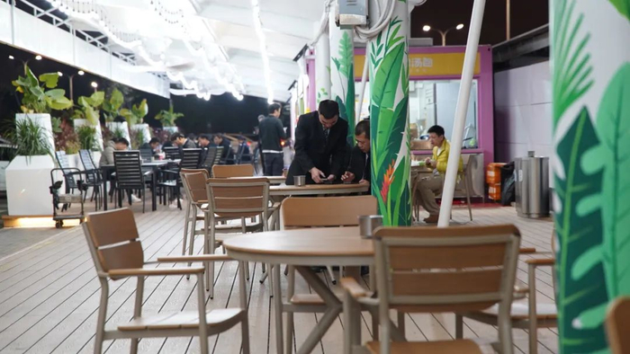 深圳机场对原有场地进行了全面翻新,铺设木质地板、新增绿化景观和装饰灯,放置了可供80人使用的休闲桌椅。