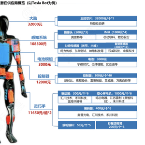 根据行业预测,单个机电执行器的价格目标为2000-3000元,一台机器人约有28个执行器,即单机价值量达数万元,而当前新能源汽车的单车价值量还在千元区间。