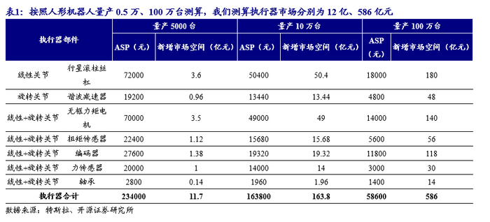 要真如马斯克所说,机器人量产目标2025年达到几千台,2026年5-10万台,2027年有望再增加10倍。那按这一出货量,相应的执行器市场就会分别达到12亿、164亿、586亿元,同样呈现倍数增长。