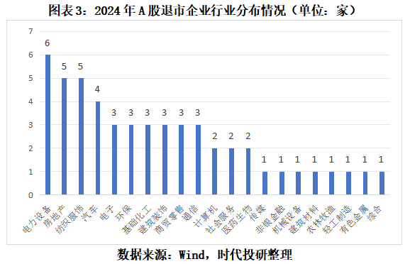 其中,电力设备行业共有6家企业退市,较去年同比增长50%,超越去年退市最多的房地产行业,成为2024年退市企业数量最多的行业。