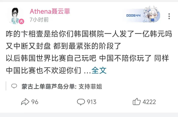 棋圣聂卫平的女儿随后发文怒怼:咋的?卞相壹是给你们韩国棋院一人发了一亿韩元吗?又中断又封盘,都到最紧张的阶段了,以后韩国世界比赛自己玩吧。