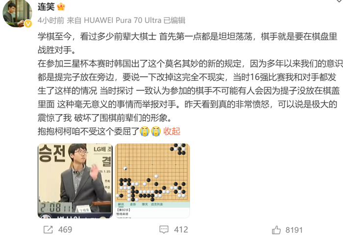 他表示:“在参加三星杯时韩国出了这个新的规定,我们当时探讨, 一致认为顶尖棋手不可能有人会因为提子没放在棋盖里面这种对棋毫无影响的事情而举报对手。昨天看到真的非常愤怒,可以说是极大的震惊了我,破坏了围棋前辈们的形象。