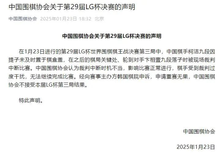 在1月23日进行的第29届LG杯世界围棋棋王战决赛第三局中,中国棋手柯洁九段因提子未及时置于棋盒盖,在之后的棋局关键处、轮到对手卞相壹九段落子时被现场裁判中断比赛。中国围棋协会认为裁判中断时机不当,影响比赛正常进行,棋手受到裁判过度干扰,无法继续完成比赛。经向赛事主办方韩国棋院申诉,申请重赛无果,中国围棋协会不接受本届LG杯第三局结果。