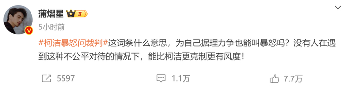 此外,蒲熠星发博力挺柯洁:柯洁暴怒问裁判这词条什么意思,为自己据理力争也能叫暴怒吗?没有人在遇到这种不公平对待的情况下,能比柯洁更克制更有风度!