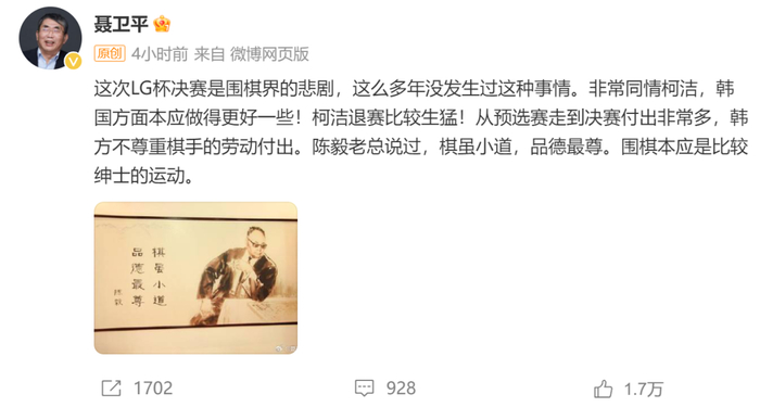 聂卫平也发文:这次LG杯决赛是围棋界的悲剧,这么多年没发生过这种事情。非常同情柯洁,韩国方面本应做得更好一些!柯洁退赛比较生猛!从预选赛走到决赛付出非常多,韩方不尊重棋手的劳动付出。陈毅老总说过,棋虽小道,品德最尊。围棋本应是比较绅士的运动。