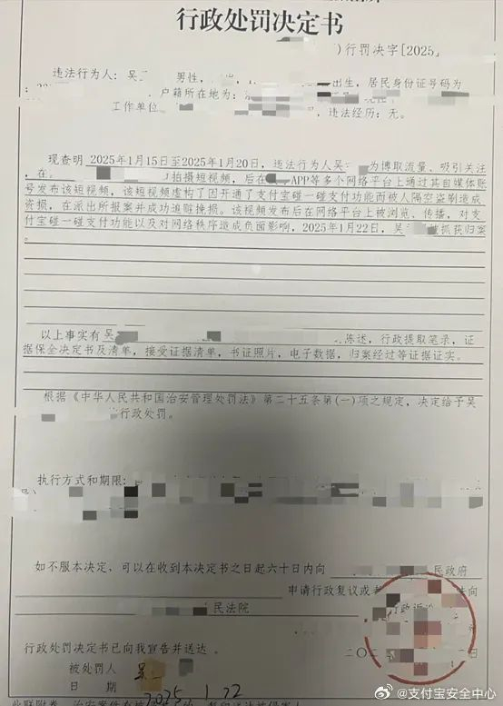 1月23日晚,支付宝安全中心发文称,近期,部分自媒体为吸引眼球和流量,发布摆拍虚假视频,捏造“使用支付宝碰一下钱被隔空盗刷”等不实内容。经公安机关依法办案,部分造谣者已受到应有的惩处。