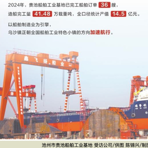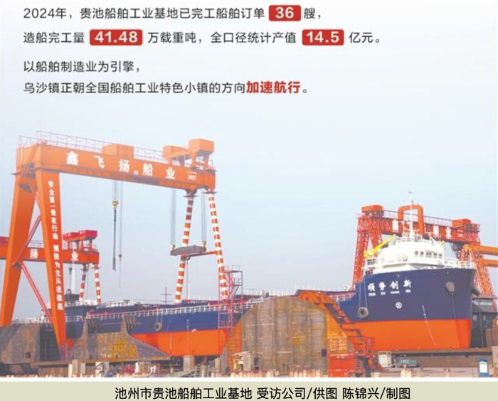 一艘“中国船”,引领了造船小镇的经济、产业、就业新航向。2024年,贵池船舶工业基地已完工船舶订单36艘,造船完工量41.48万载重吨,全口径统计产值14.5亿元。以船舶制造业为引擎,乌沙镇正朝全国船舶工业特色小镇的方向加速航行。