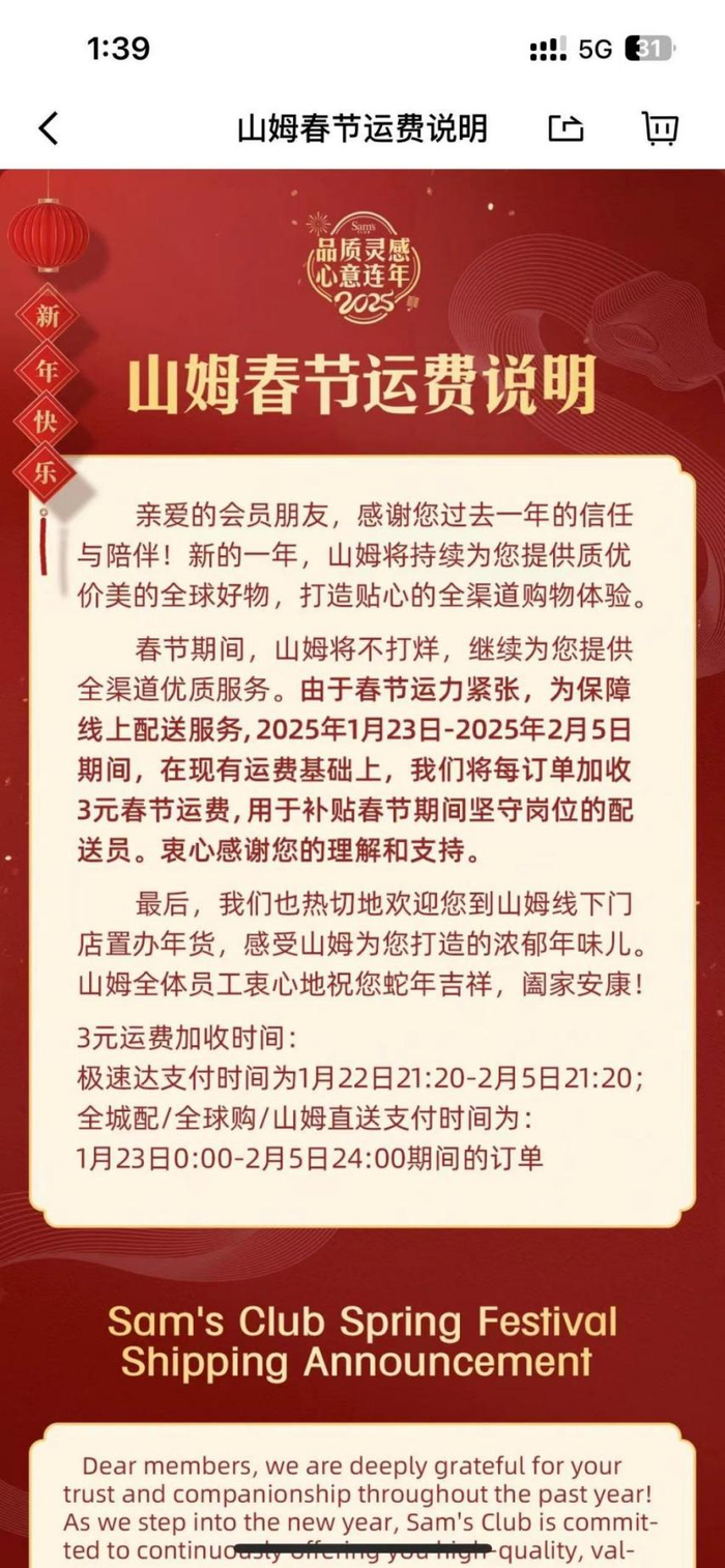 山姆公告显示,2025年1月23日-2025年2月5日期间,在现有运费基础上,山姆将每订单加收3元春节运费,用于补贴春节期间坚守岗位的配送员。
