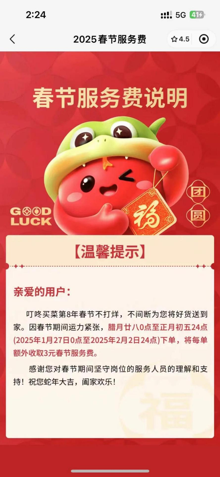 叮咚买菜App发布的公告显示,因春节期间运力紧张,腊月廿八0点至正月初五24点(2025年1月27日0点至2025年2月2日24点)下单,将每单额外收取3元春节服务费。这也是该平台第8年在春节期间进行配送。