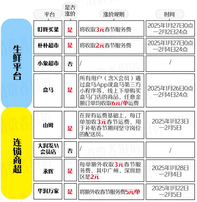 永辉超市公告显示,除夕0点至初七24点(2025年1月28日至2月4日24点)下单,将每单额外收取3元春节服务费,其中广州、深圳地区是2元。华润万家超市则在1月22日至2月5日期间额外收取春节服务费5元/单。