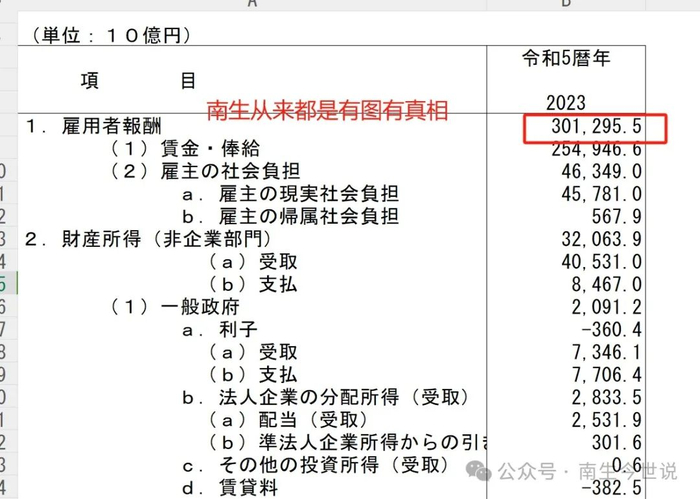 以日本内阁府公开的报告为准,2023年的GDP总额为5919125亿日元,雇员报酬总金额为3012955亿日元,占比50.9%。看到了吧,居然比我国GDP结果中的“雇员报酬占比低了1.2个百分点”。