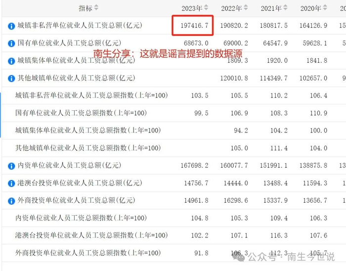 看到了吧,这就是那些散播谣言人使用的障眼法,他们将我国“城镇非私营单位就业人员的工资总额”,包装成全国居民的薪酬总额。