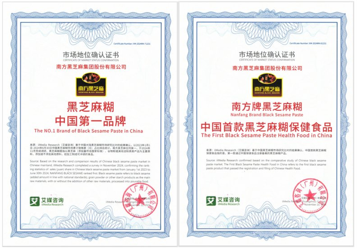 目前南方黑芝麻的行业地位及品牌影响力已经获得了市场的广泛认可,品牌力不断增强,行业地位不容撼动。2024年12月,南方黑芝麻荣获第三方机构艾媒咨询发布的“黑芝麻糊中国第一品牌”“中国首款黑芝麻糊保健食品”两项市场地位认证。认证显示,基于中国大陆黑芝麻糊市场研究比对的结果确认,以2023年1月1日-2024年6月30日中国黑芝麻糊市场累计销售额(元)占比排名统计,南方黑芝麻位列第一。同时,基于中国黑芝麻糊市场研究比对的结果确认,南方黑芝麻为中国首家通过中国保健食品注册备案的黑芝麻糊企业。