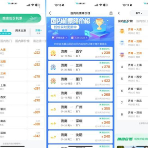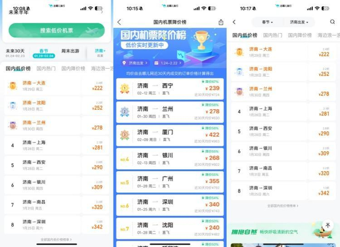 记者查询订票软件的机票价格国内降价榜发现,在春节期间,1月28日到2月4日之间,从济南出发到不少热门目的地都有特价机票,例如1月28日,济南-广州,最低价为350元,近30天均价为792元,最高降幅达56%;1月28日,济南-珠海,最低价为484元,近三十天均价792元,最高降幅达39%;1月28日,济南-昆明,最低价为446元,近三十天均价709元,最高降幅达37%;1月28日,济南-上海,最低价为281元,近三十天均价为430元,降幅高达35%。