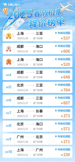 2025年春节机票大跳水 部分航线跌至百元