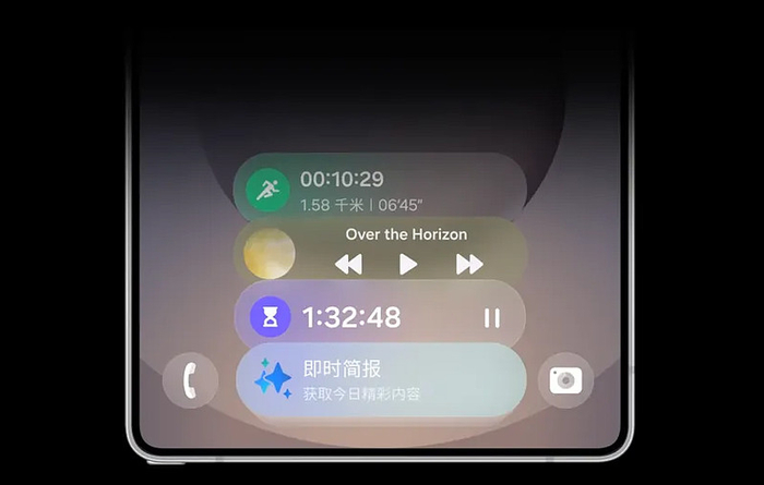 简单而言,即时简报功能的核心在于对每天重要事项(如天气、新闻、日程、行程安排、重要事项提醒等)进行摘要推送,并可基于此为用户提供智能化建议;实时窗则可被视为锁屏组件的升级版——在实时窗中,用户可以将日常习惯和常用的应用无缝集成到锁屏界面,实现诸如音乐控制、视频的播放、实时提醒等一系列功能。