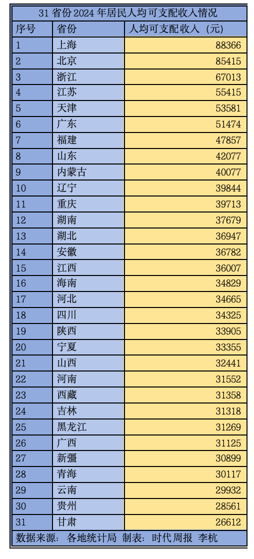 上海和北京相较其他省份居领先地位。其中,上海居民人均可支配收入达到88366元,北京则达到85415元;浙江以67013元位居第三,也是唯一的“6万+”省份。