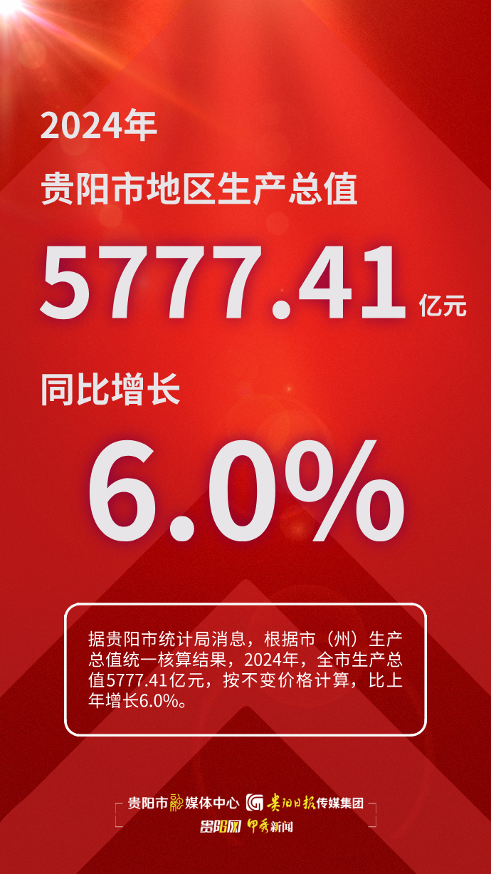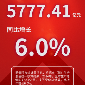据贵阳市统计局消息,根据市(州)生产总值统一核算结果,2024年,全市生产总值5777.41亿元,按不变价格计算,比上年增长6.0%。
