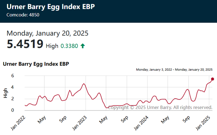 根据市场研究公司Urner Barry的监测显示,截至1月20日,该公司用于跟踪和分析鸡蛋批发价格的指标Urner Barry Egg Index已经创下了了每打(12枚)鸡蛋5.4美元的历史新高,远远超过了2022年12月创下的4.65美元的历史前高纪录。预计批发价格上涨将继续对美国超市的零售鸡蛋价格带来上行压力。