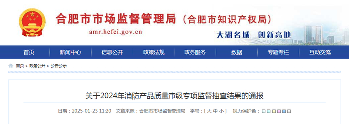 合肥市市场监督管理局通报2024年消防产品质量市级专项监督抽查结果