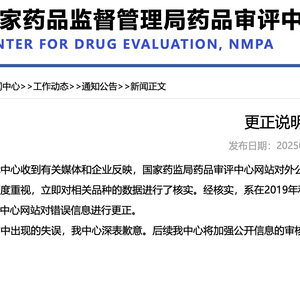 据国家药品监督管理局药品审评中心官网,药审中心数据管理处发布更正说明称,近日,中心收到有关媒体和企业反映,国家药监局药品审评中心网站对外公开的个别品种存在数据重复的问题。中心高度重视,立即对相关品种的数据进行了核实。经核实,系在2019年和2021年公开相关产品信息时,由于编辑错误导致上述问题。中心已第一时间在中心网站对错误信息进行更正。对于工作中出现的失误,中心深表歉意。后续中心将加强公开信息的审核力度,避免类似问题再次发生。欢迎社会各界监督!