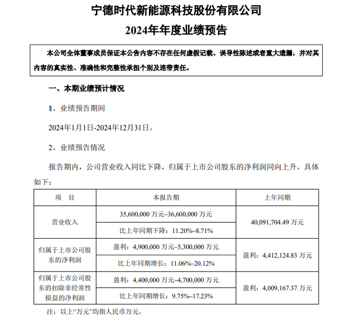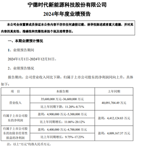 1月21日晚,宁德时代发布业绩预告,公司预计2024年收入在3560亿元-3660亿元,同比下降8.71%-11.2%;实现归属于上市公司股东的净利润490亿元-530亿元,同比增长11.1%-20.1%。