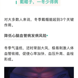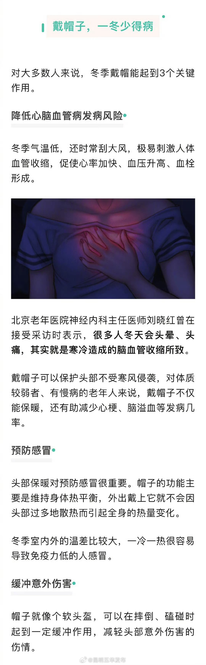 真的建议大家冬天出门戴帽子冬季外出戴帽子,犹如给身体加上一个盖子,减少热量散发,让身体更好地保暖。有研究表明,静止状态下不戴帽子,气温15摄氏度时,人体约1/3的热量会从头部散发;而气温在4摄氏度左右时,约一半的热量从头部跑掉。对大多数人来说,冬季戴帽能起到3个关键作用。(生命时报)