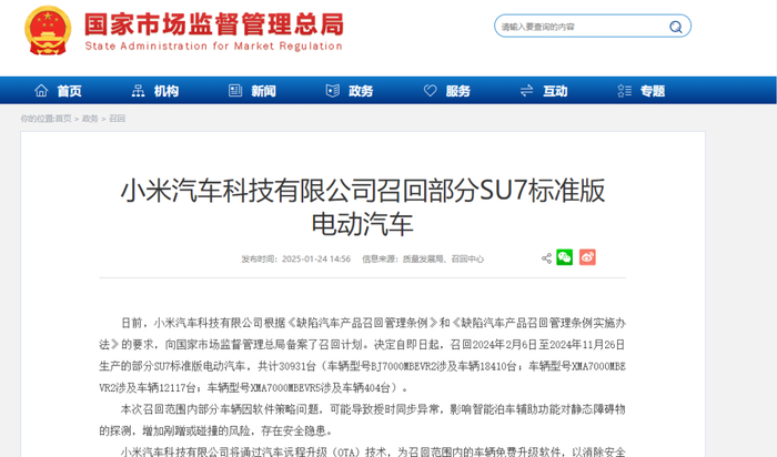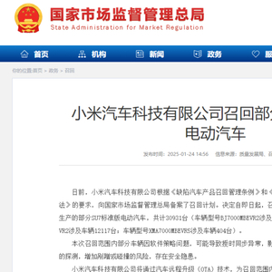 据国家市场监督管理总局网站,日前,小米汽车科技有限公司向国家市场监督管理总局备案了召回计划。决定自即日起,召回2024年2月6日至2024年11月26日生产的部分SU7标准版电动汽车,共计30931台(车辆型号BJ7000MBEVR2涉及车辆18410台;车辆型号XMA7000MBEVR2涉及车辆12117台;车辆型号XMA7000MBEVR5涉及车辆404台)。