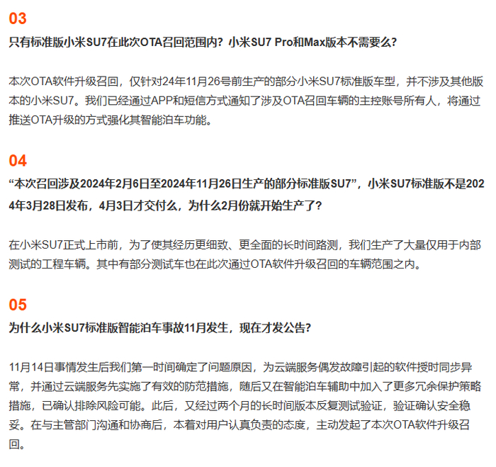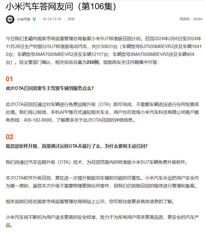 今天下午,@小米汽车 发文,称今日主动向国家市场监督管理总局备案小米SU7标准版OTA召回计划,并就网友关注问题集中作答。