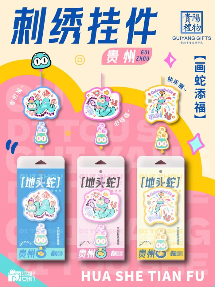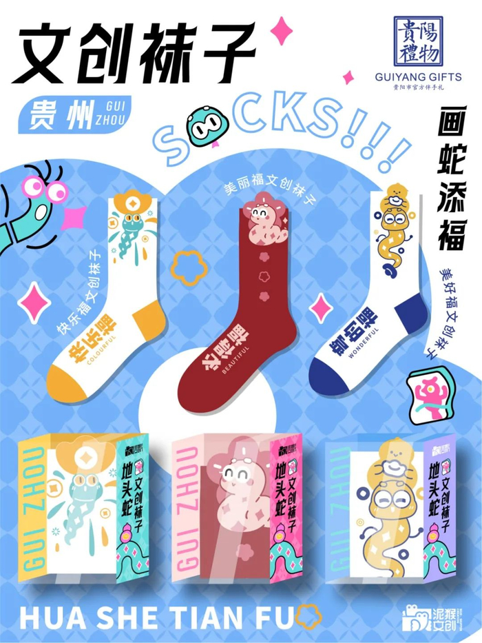 贵阳礼物推出的「贵阳故事蛇年文创」系列共计19款产品,是了解贵阳历史文化、人文风情的绝佳载体。其中,心心猴系列祈福挂、画蛇添福刺绣挂件、画蛇添福文创袜子等产品,将贵阳特色与蛇年元素巧妙融合,兼具文化与纪念意义。带得走的贵阳集章册、诗画四季贵阳冰箱贴等文创产品,满足了游客和市民对贵阳文化的收藏需求,是游客和市民兼具纪念意义与文化价值的收藏好物。同时由于设计时尚有趣又足够实用,成功在年轻群体中获得「圈粉」无数,并形成良好的口碑传播效应。