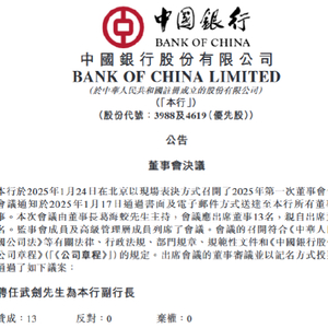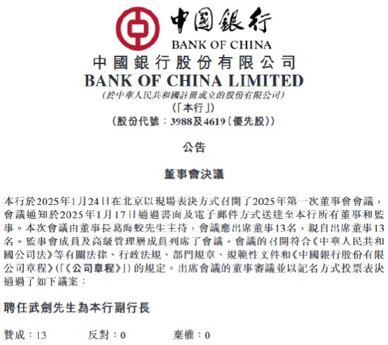 1月24日金融一线消息,中国银行发布公告称,董事会同意聘任武剑先生为该行副行长。
