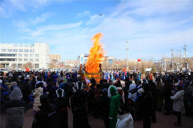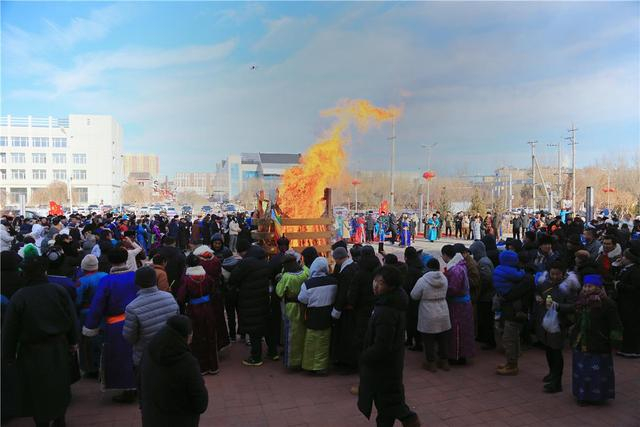 上午10点,祭火仪式正式开始,伴随着主持人的热情赞颂,放有木柴的“图拉嘎”被点燃,霎时烈焰腾空。身着节日盛装的人们围绕旺火,期盼新的一年草原风调雨顺,人民安居乐业。活动现场,非遗美食飘香四溢,为居民送上了“舌尖上的盛宴”。