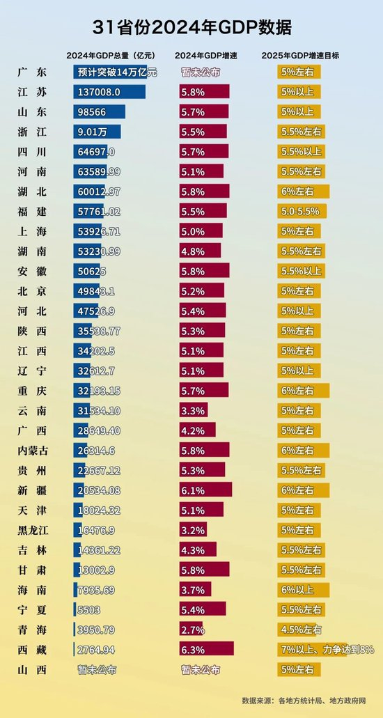 在2024年中国GDP跨过130万亿元新台阶的同时,多个省份也完成了经济规模进阶。着眼2025年,他们已有了新目标。