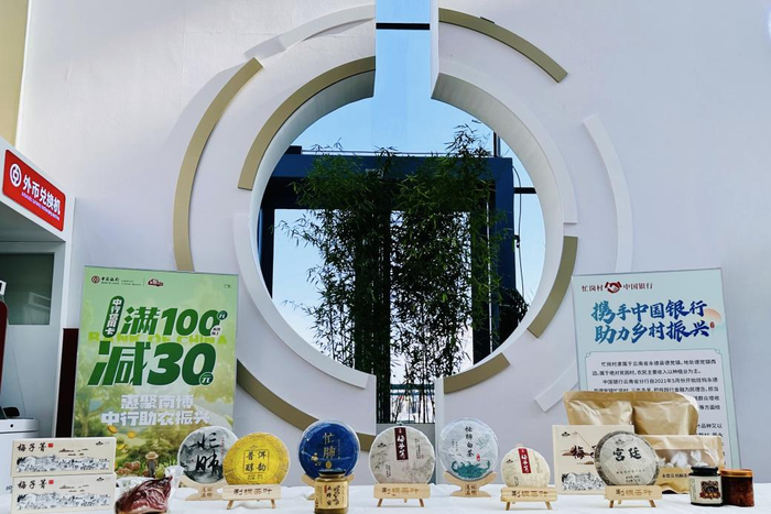 南博会期间,云南中行在金融服务中心“乡村振兴展区”展示忙岗村特色农产品,以消费帮扶助力忙岗村发展。