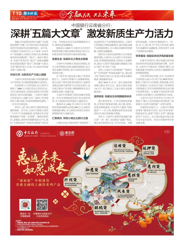 在新的历史起点上,云南中行将继续秉承“服务地方经济、助力实体发展”的使命担当,深耕“五篇大文章”,激发新质生产力活力,为云南在推进中国式现代化中走在前列、作出示范提供坚实的金融支撑。