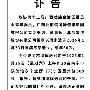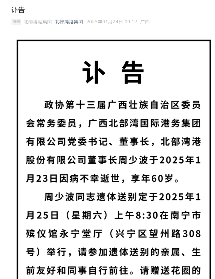 今日(1月24日),广西北部湾国际港务集团有限公司(简称北部湾港集团)发布讣告,政协第十三届广西壮族自治区委员会常务委员,广西北部湾国际港务集团有限公司党委书记、董事长,北部湾港股份有限公司董事长周少波,于2025年1月23日因病不幸逝世,享年60岁。