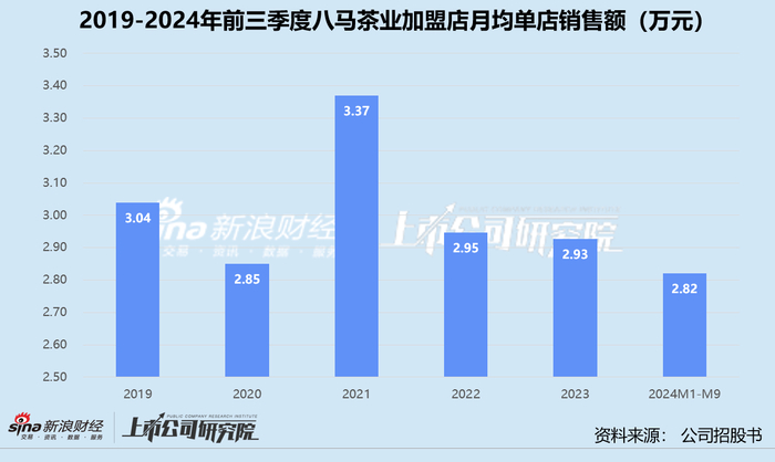 这决定了八马茶业加盟店销售额增长空间有限。基于向加盟商销售收入和期末加盟店数量粗略推算,2019-2023年,公司加盟店单店月均销售额基本徘徊在3万元上下。2024年前三季度,可选消费需求持续疲软,单店月均销售额降至历史新低2.82万元。与此同时,房租、人工等固定成本无法通过销售业绩有效分摊,加盟商唯有向总部减少采购以维持运营。