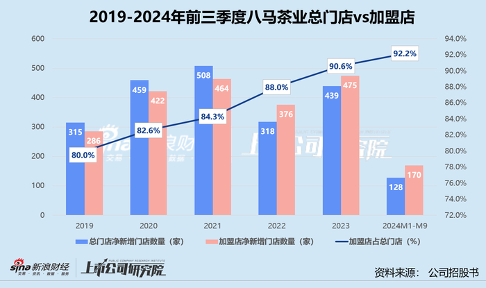 结合多版招股书披露的往期数据分析,2019-2021年期间,八马茶业总门店数量同比增速保持在25%上下,2023年平均每周净新增门店数量高达10家。而在2019-2021年的净新增门店中,超过90%是加盟店。2022-2024年前九个月,加盟店净新增数量甚至比门店整体净新增数量还多。正因如此,加盟店占门店总数的比例由2019年的80.0%一路走高至2024年前三季度的92.2%。